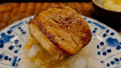 日本三大清流の長良川で取れる立派なマスに甘辛いタレを塗って焼いたものと合わせる花山椒が素晴らしい。