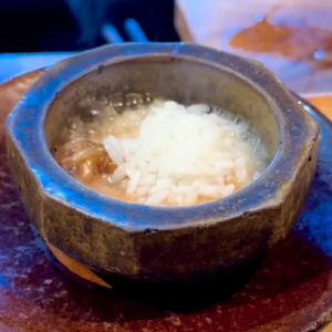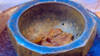 熱々の焼き石を使ってホタルイカを加熱して作るお粥に、最後に生姜汁を絞り入れると、美味しいだけでなく、肝臓のアンチエイジングに最適な料理になります。